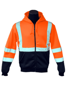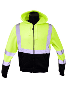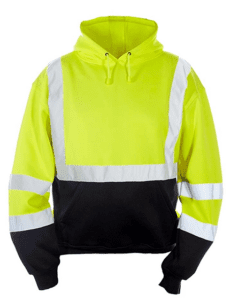 Picture of worker visible in the night due to wearing a high visibility hoodie. Working outdoors in the fall means working in cool wet conditions.  Our collection of Hi Viz outerwear will make you more visible to traffic, our sweatshirts will keep you warm, and our rain gear will keep you dry.