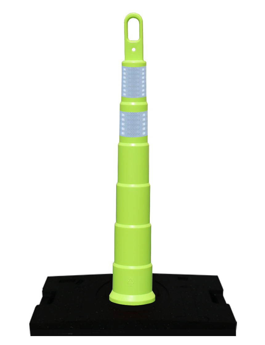 Lime Looper-Cones are 42" tall and are ballasted by 16 or 30 lb. Recycled Rubber Bases. The Looper Cone comes with the three options for reflective collars for night-time visibility: