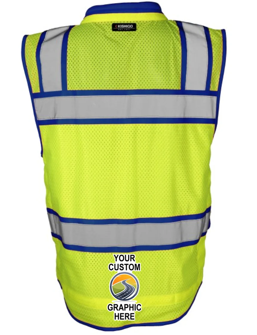 Kishigo Color Contrast High Performance Surveyors Lime & Blue, Class 2 Safety Vest, Large with Full Color Graphic