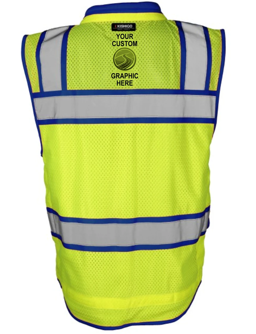 Kishigo Color Contrast High Performance Surveyors Lime & Blue, Class 2 Safety Vest, Large with Single Color Graphic